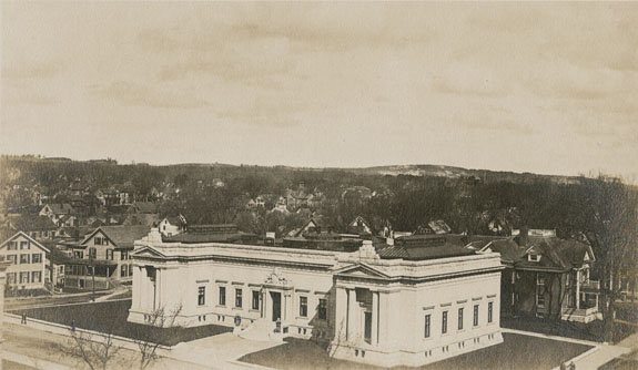 This photograph of the New Hampshire Historical Society Library building, located at 30 Park Street in Concord, New Hampshire, also shows the “quarry in background from which the granite came”.