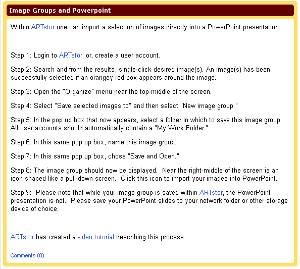 Spotlight on: The ARTstor and Oxford Art tab within this last guide. This tab details the steps to collect images from ARTstor and swiftly import them, direct from the ARTstor database, into Powerpoint. ARTstor has an excellent video tutorial of this process.