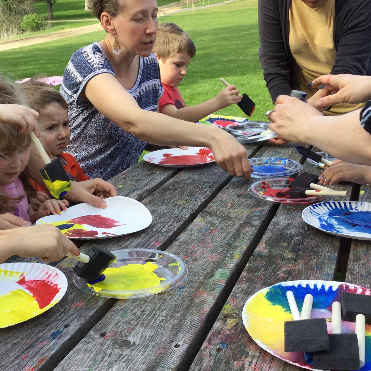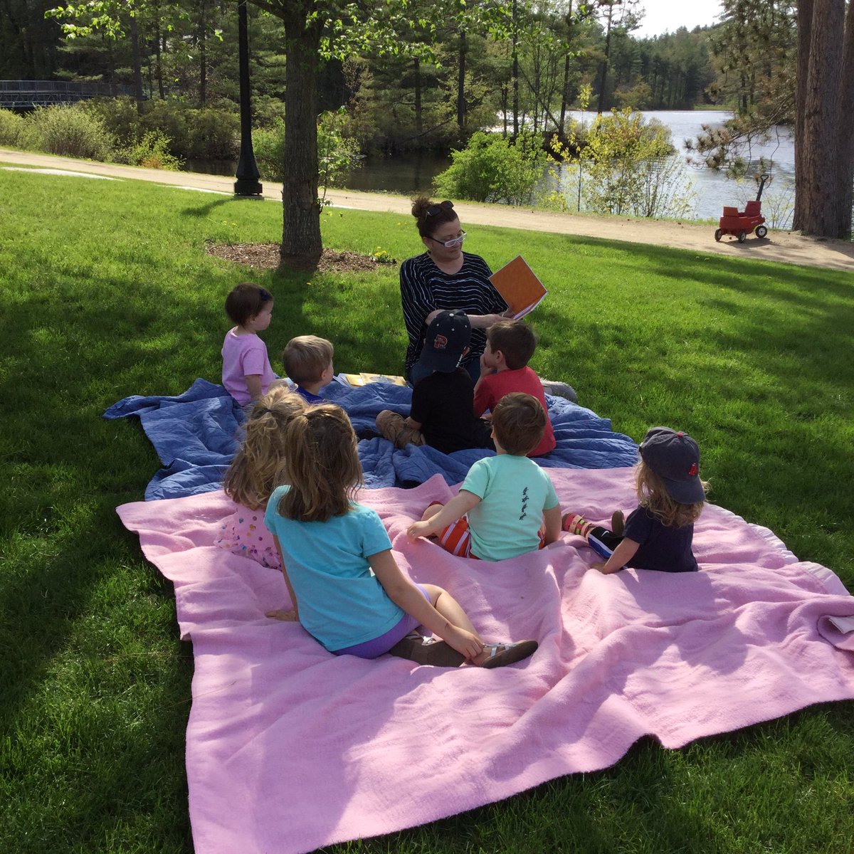 Outdoor Storytime with Mrs. Kittler and SPS community friends – painting chameleon colors and enjoying a wonderful story on the grass near the pond.