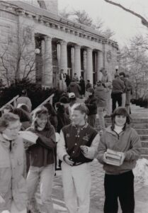 Students helped move books from the old Sheldon Library to the new Ohrstrom Library, in an event that took place on January 4, 1991. For a few hours during the middle of the day the students formed a continuous line that began at Sheldon and ran all the way to Ohrstrom Library. They passed books along the line and succeeded in moving a portion of the books into the new library. SPS teamwork in action!