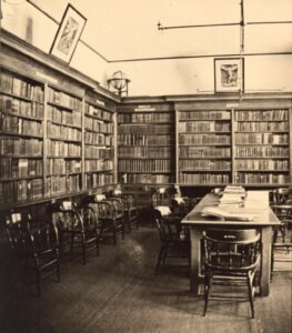 In 1888, when the Big Study was enlarged, the library moved to the upper floor of the expansion in Room #2 of the Big Study Annex. This new location had space for 12,000 volumes and seating for twice the number of students as in the original location.  Charles S. Knox became the second librarian, and he is credited with the creation of a fine reference collection. He was also the first to gather together all the books relating to Shakespeare onto special shelves, a practice still reflected today in Ohrstrom Library’s Shakespeare Room.  A large selection of books from these early libraries is now housed in the Archives.