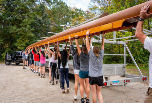 To lend authenticity to some of the scenes, the movie production crew searched for a 1930’s era shell, and where do you think they found it? Right here in Millville! Sitting in the boathouse was a 1938 eight-oared shell, 60 feet long and made of western red cedar and sitka spruce. According to SPS boatman Matt Bailey, the boat was in really good shape. He made some minor repairs, replaced a few missing seats, and handwashed it (several times!) before it was loaned out. He said, “It could have been rowed just as it was, it was in that good shape even after all these years. We have boatmen from years past to thank for that.”