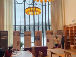 To that end, we are thrilled to have The 1619 Traveling Exhibit on view in the Baker Reading Room. Created by the Hampton History Museum in Hampton, Virginia, the exhibit tells the history of the first Africans to arrive in English North America. The story begins in Angola in West Central Africa, where people were captured to be sold into slavery. Bound for Mexico, a chance encounter on the sea led them to Port Comfort, Virginia (in present-day Hampton), where they were traded for goods and services. Soon after their arrival, that location became the site of the very first African-Americans to be born in the USA, and today–more than 400 years later–people in Hampton can trace their ancestry back to those very first children.