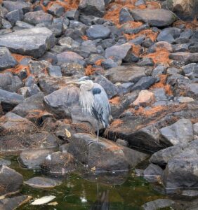 On the rocks near the dam behind Friedman rests our resident heron, Hank. There are mentions in The Pelican of the “heron near the dam” and “the heron returning” going back fifty years, to the late 1970s and early 1980s.