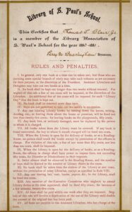 The Library Association was formed by Rev. Hall Harrison in 1874. Members were entitled to check out books and were granted use of the reading room. Annual dues ranged from $1.00-$5.00. The Library Association was managed by an Executive Committee consisting of the librarian, teachers, and students representing all forms. The committee was responsible for purchasing books, cataloging, shelving, supervising the reading room, and checking books in and out. They met regularly on the first Saturday of the month.