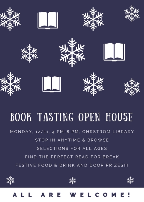 Stop by the library Monday, 12/11 between 4 PM – 8 PM for our Book Tasting Open House. Browse our selection of Top Reads, Best of 2017, favorite authors and more. Raffles for advanced reader copies of books and festive snacks will be provided. Pick up a great read or two for your holiday break! Selections available for ALL ages.