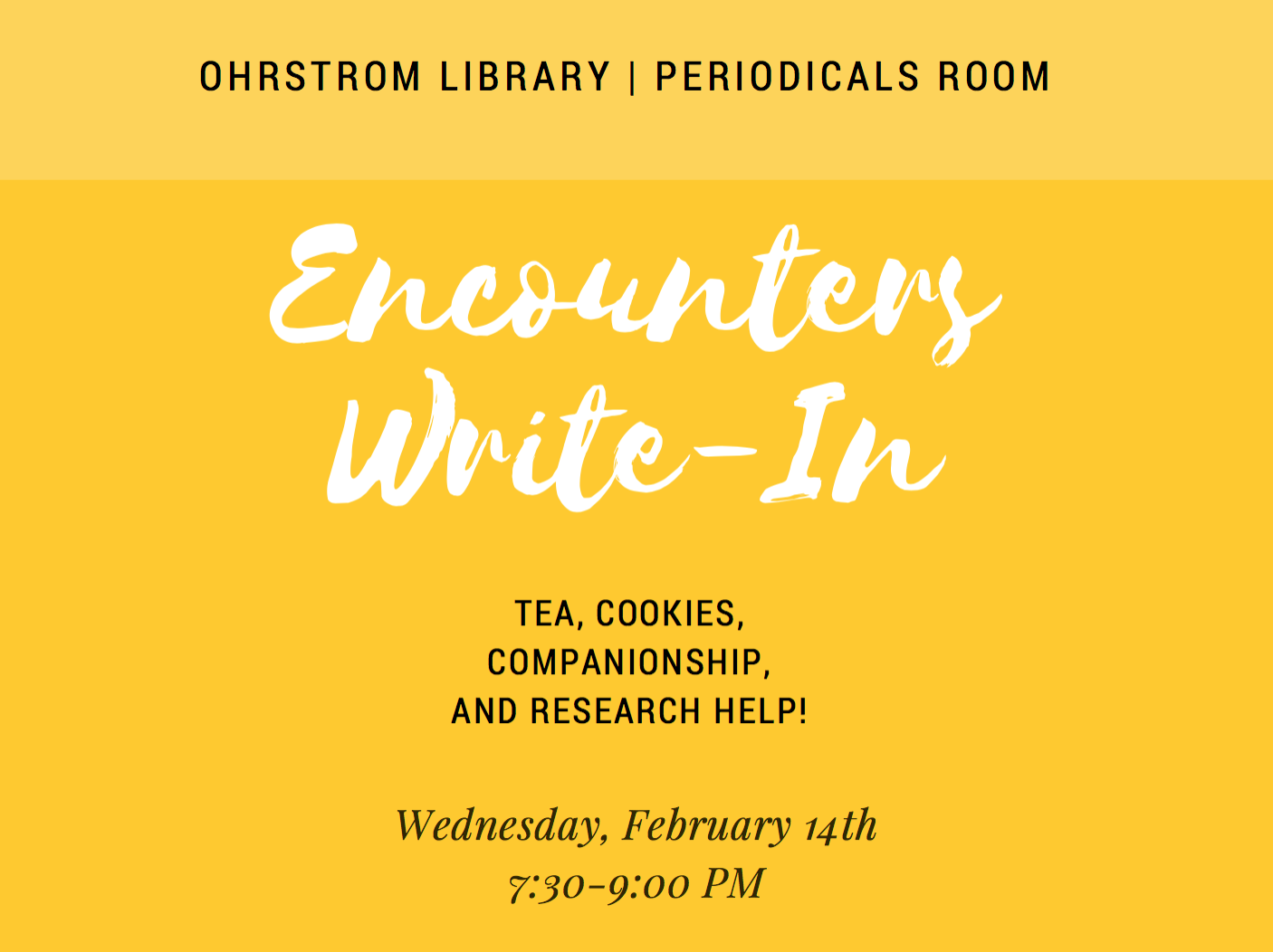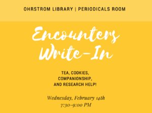 Encounters students: join Ms. Sanborn in the Periodicals Room on Wednesday, Feb. 14th for refreshments and research support as you finish up your papers!