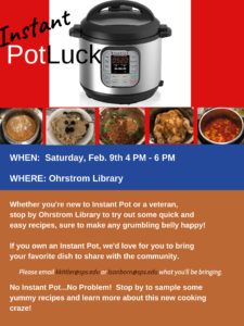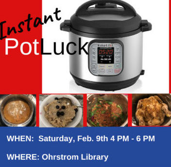 The new “must have” kitchen tool is the Instant Pot. Stop by the library on Saturday, 2/9 between 4 PM – 6 PM to learn more and to sample some delicious dishes!
