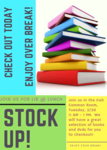 Can’t make it to the library before break?  No problem!  We will be bringing a selection of books/dvds to the Coit Common room this Tuesday, 2/26,  11 AM – 1 PM.  Check out and enjoy over break.