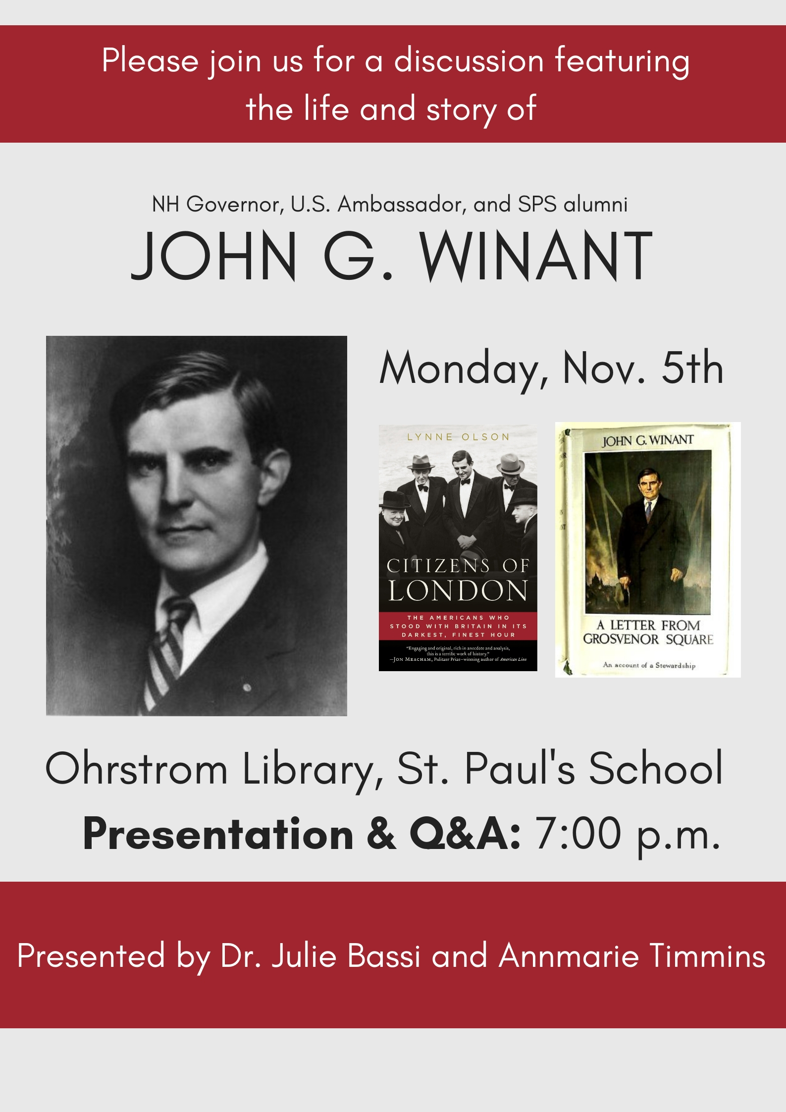 Dr. Julie Bassi and Annmarie Timmins present the life and story of SPS Alumni, NH Governor, and U.S. Ambassador, John G. Winant. Please join us for an informative discussion. Light refreshments will be served.