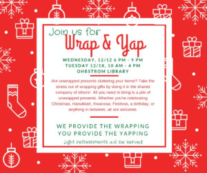 Are piles of unwrapped presents on your floor bringing you down? Stop by the library for our drop in wrapping event.