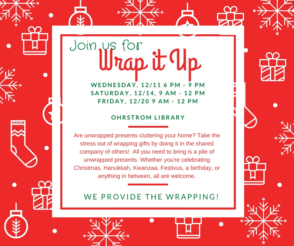 Bring your unwrapped presents to the library during one of our Wrap it Up events and get your wrapping done for the season!