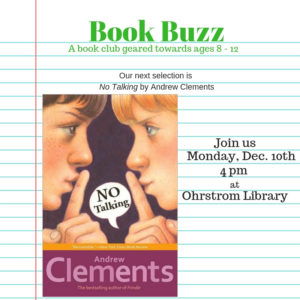 Book Buzz is a book club geared towards ages 8 - 12. Join us for a lively discussion of the book No Talking, by Andrew Clements. After our discussion, we will enjoy a few minutes at the Book Tasting event!