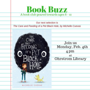 Book Buzz is a book club geared towards ages 8 - 12. Join us for a lively discussion of our latest selection, The Care and Feeding of a Pet Black Hole by Michelle Cuevas.