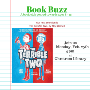 Book Buzz is a book club geared towards ages 8 - 12. Join us for a lively discussion of our latest selection, The Terrible Two by Mac Barnett.