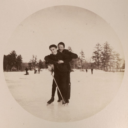 A Kodak No. 2 type photograph taken in 1890 by Theodore Mitchell Hastings, Form of 1894, while a student at St. Paul’s School. The boy on the right is not identified, but appears from other identified photographs to be William Baker Whelen, Form of 1895. In the background are a number of other students skating and playing hockey on Lower School Pond.