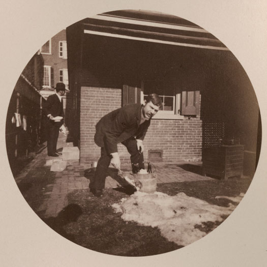 A Kodak No. 2 type photograph taken in 1890 by Theodore Mitchell Hastings, Form of 1894, while a student at St. Paul’s School. An unidentified man is shown shoveling snow into a bucket full of beverage bottles.
