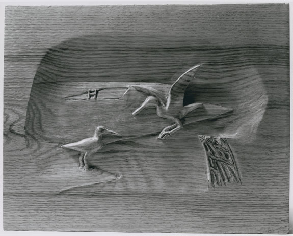 The second of two wood carvings created by Chalres Greenough (Chippy) Chase ’26 to document events occurring during the 6th Form year of the Form of 1956. Events illustrated on the plaque were described in the Autumn 1961 Alumni Horae (pg. 120): “The second panel, showing a yellowlegs on a beach, denotes the founding of the Francis Beach White Ornithological Society, with the Hitchcock Field in the background.”
