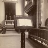 This photograph shows the New Chapel looking toward the chancel. This early interior view shows the sanctuary prior to the addition of the reredos in 1894, and the expansion of 1928.