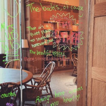 Some wonderful feedback from our students written with special markers on the glass doors, telling us what they love about the library. “The books, of course!”